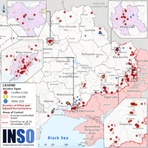 “As Ukraine enters the fifth year of full-scale war, the risks facing humanitarian workers and other civilian responders continue to evolve in complexity and scale. Their deaths are neither inevitable nor acceptable and cannot be normalised as a feature of the operating environment. In a context where reliable safe corridors are absent, distinction is increasingly difficult to maintain, and visibility alone offers no meaningful protection, rigorous data collection and credible analysis remain essential for understanding harm, challenging impunity, and reinforcing the norms designed to safeguard civilians and those who assist them. Sustained accountability, grounded in accurate reporting and evidence-based risk analysis, is critical to ensuring that humanitarian action remains principled and that the individuals who deliver lifesaving assistance are afforded the protection they are due under international humanitarian law.” Says Ian Spence, Country Director, INSO Ukraine.